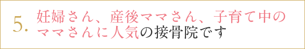 マタニティ期の腰痛やむくみ、産後骨盤矯正、育児中の腱鞘炎、肩こり、膝の痛みなど、3児のパパの院長と、子ども好きなスタッフが対応しますので安心してご来院ください。