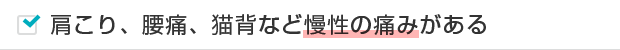 長期にわたり痛みを感じている方は患部だけでなく姿勢や生活動作にも問題があることが考えられます。